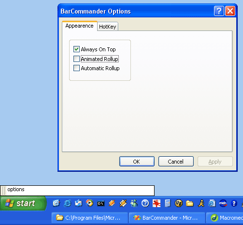 Description:BarCommander is a small, unobtrusive, yet powerful program, that allows one to execute commands on a small floating toolbar. BarCommander has quite a few useful features: